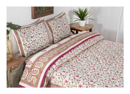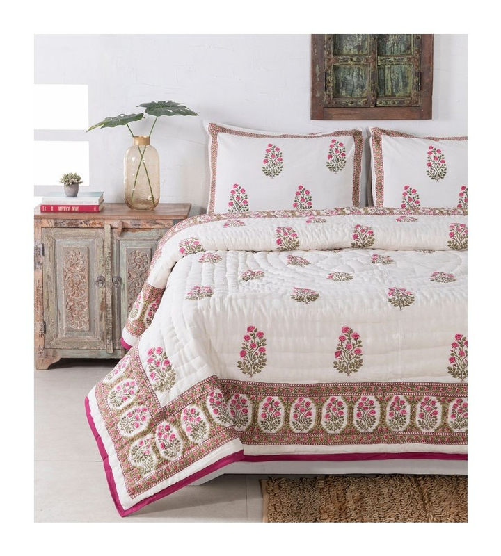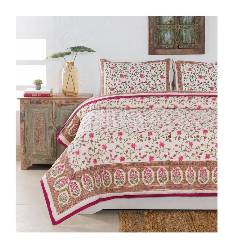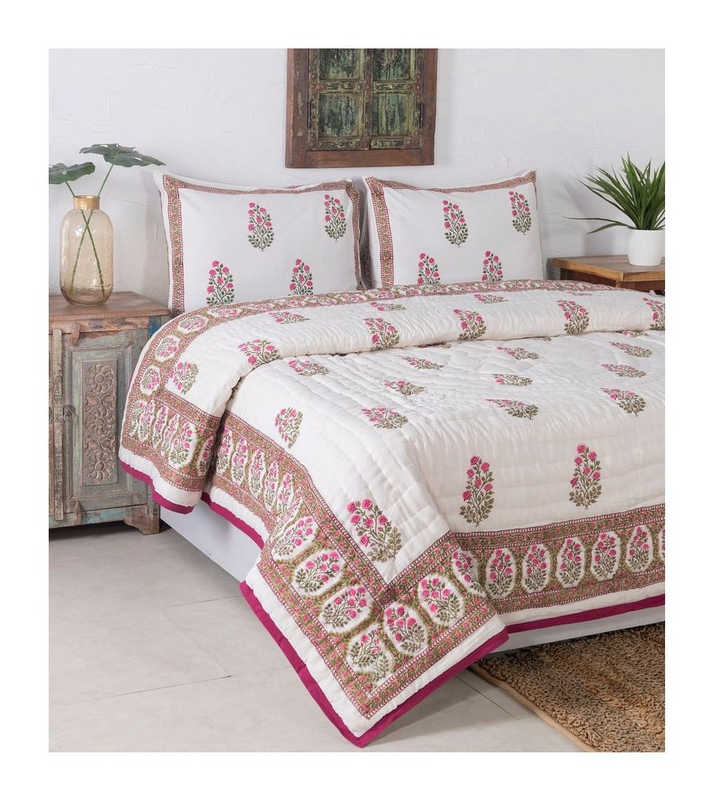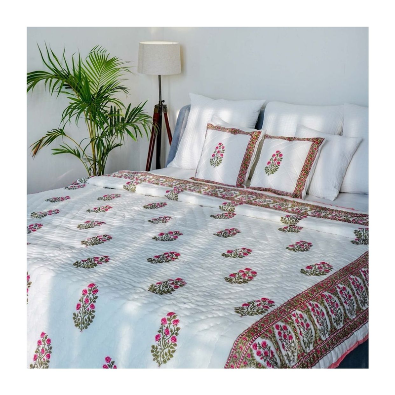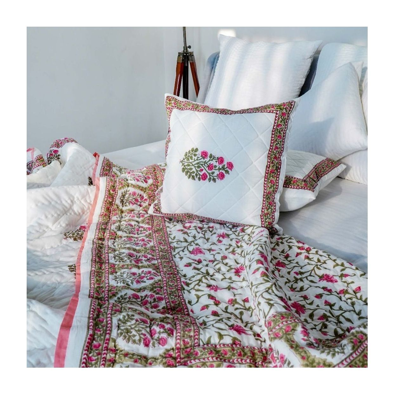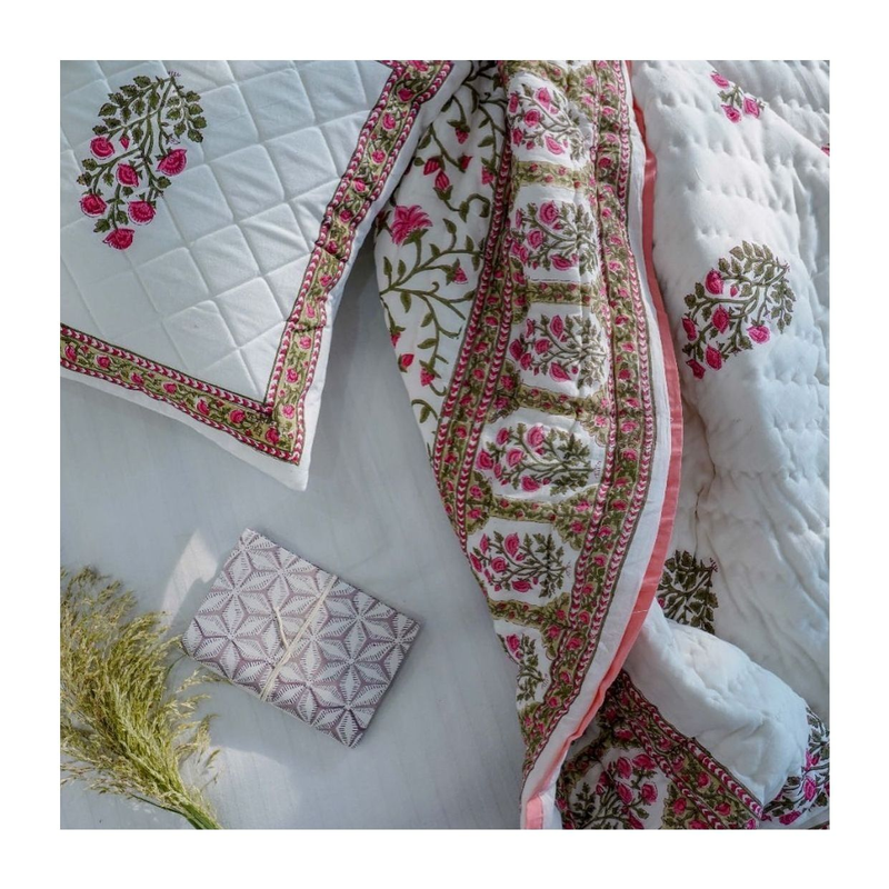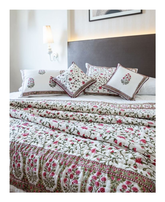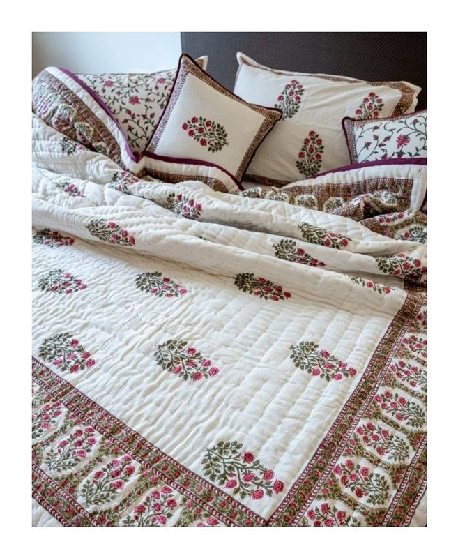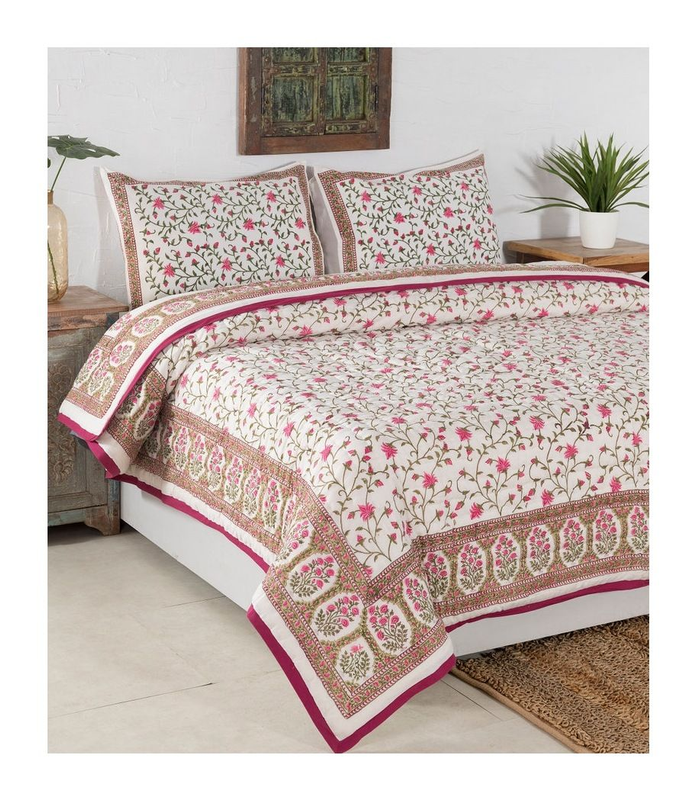 This is Complete bedding set of 6 pieces1 Reversible double bed quilt1 Bedsheet2 Reversible pillow covers2 Cushion Covers
